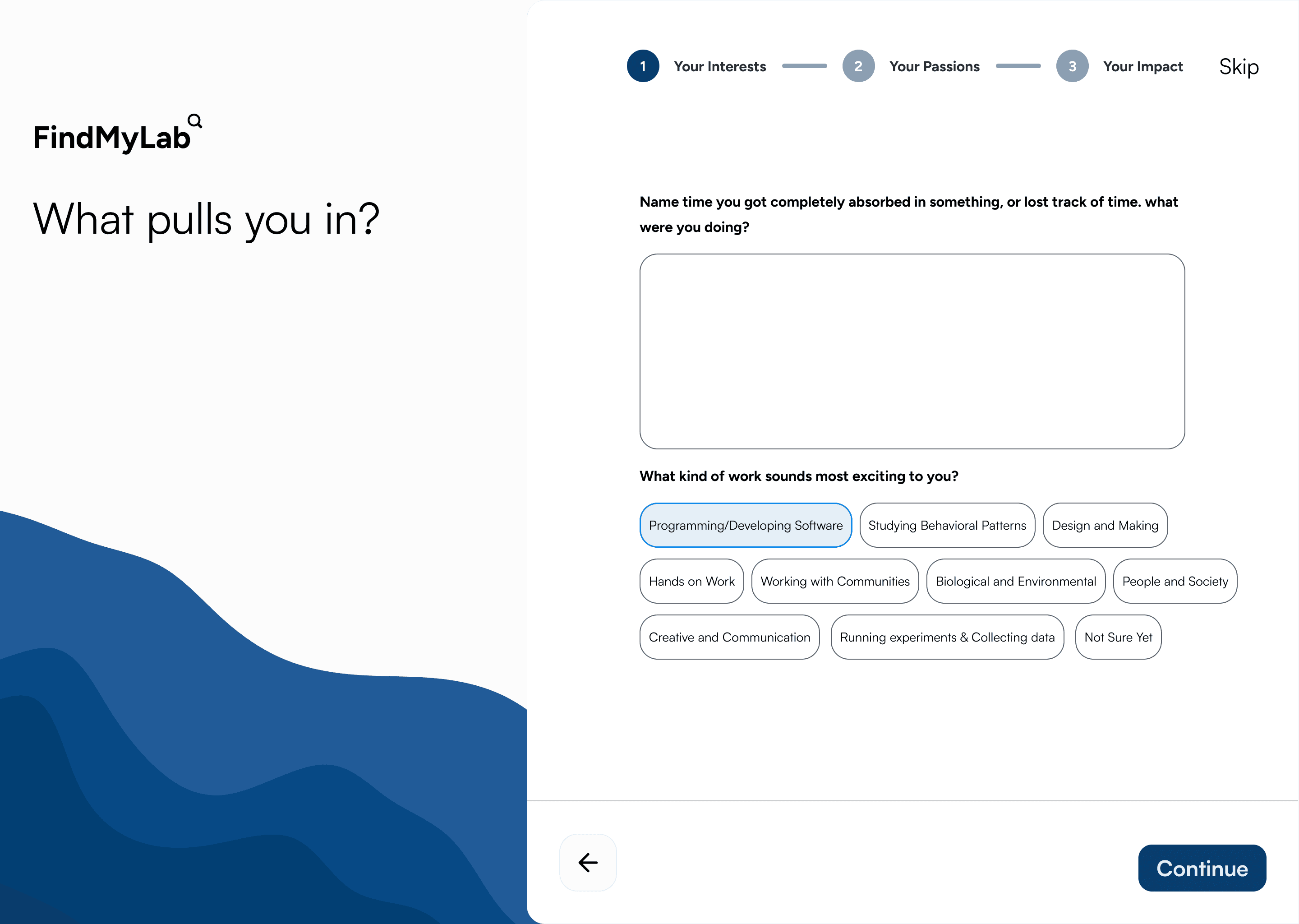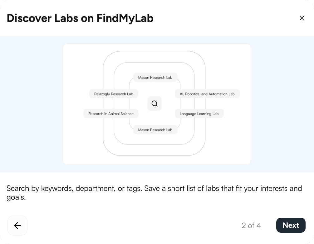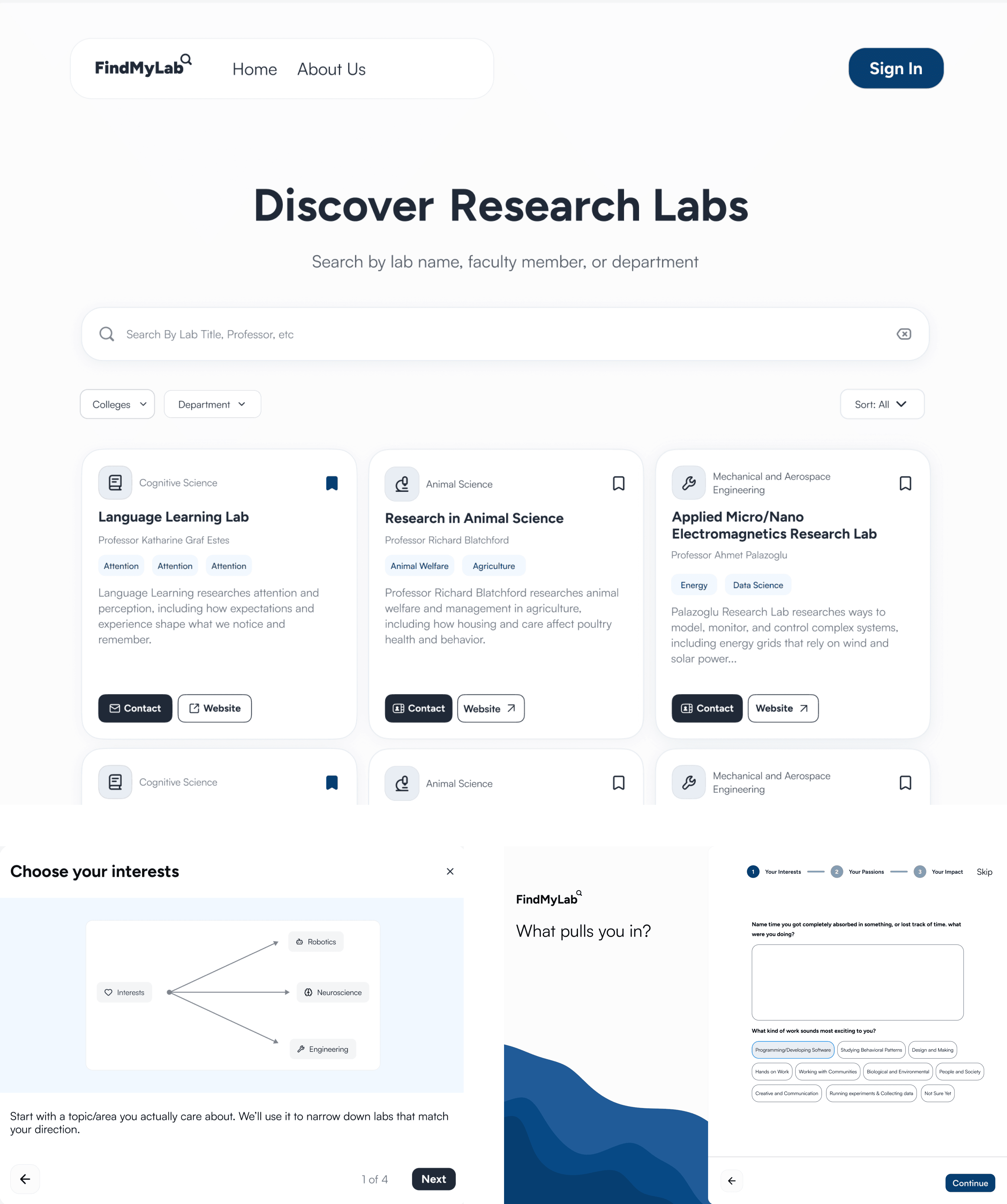 For newer students like Daniel, the questionnaire gives a clear place to start, and for experienced students like Ryan, it shows labs that match their major, experience, and research interests so they don’t have to spend time browsing. This turns FindMyLab from a simple directory into a helpful tool that makes finding the right lab faster and easier.