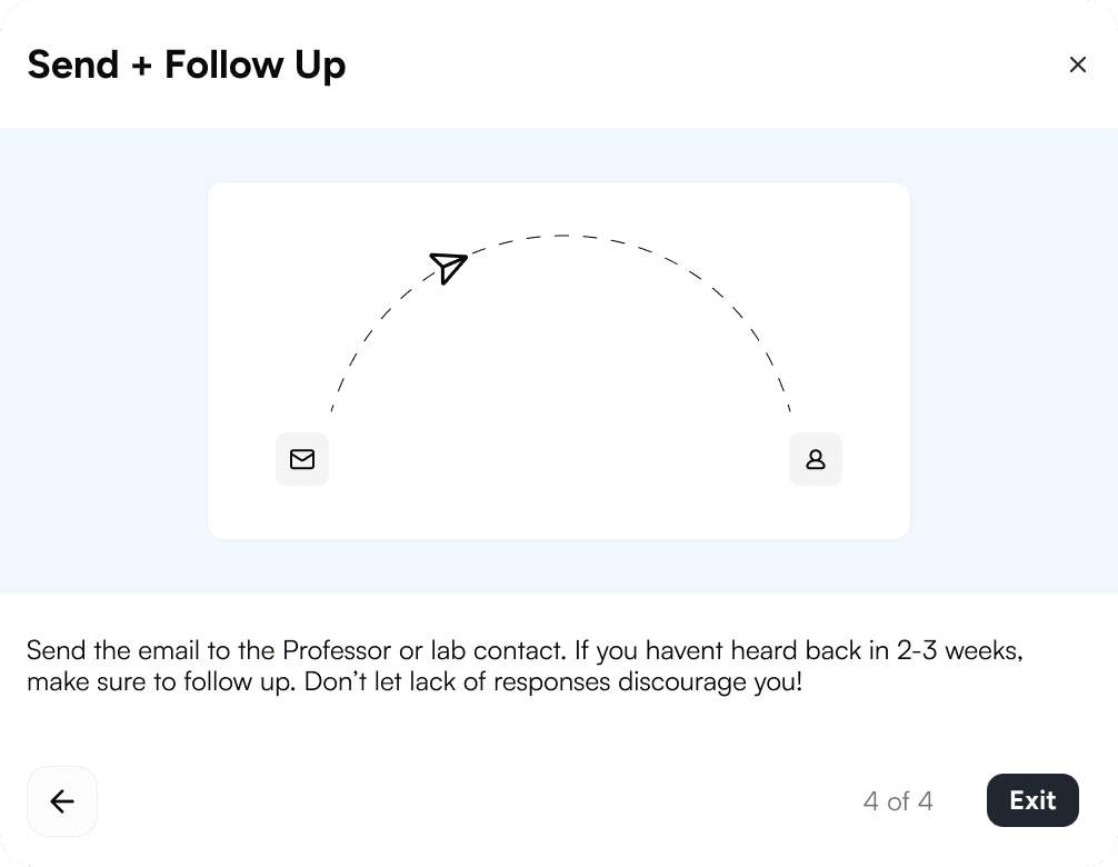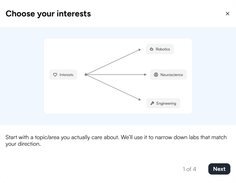Daniel’s main barrier isn’t just the fact that labs are hard to find. It's understanding how research works. A list of labs also doesn’t help if he doesn’t know what they do or what his role might be. As a way to address this, we created short and simple infographics that explain the research cycle and what students actually do, giving him the context he needs to find their next lab. .