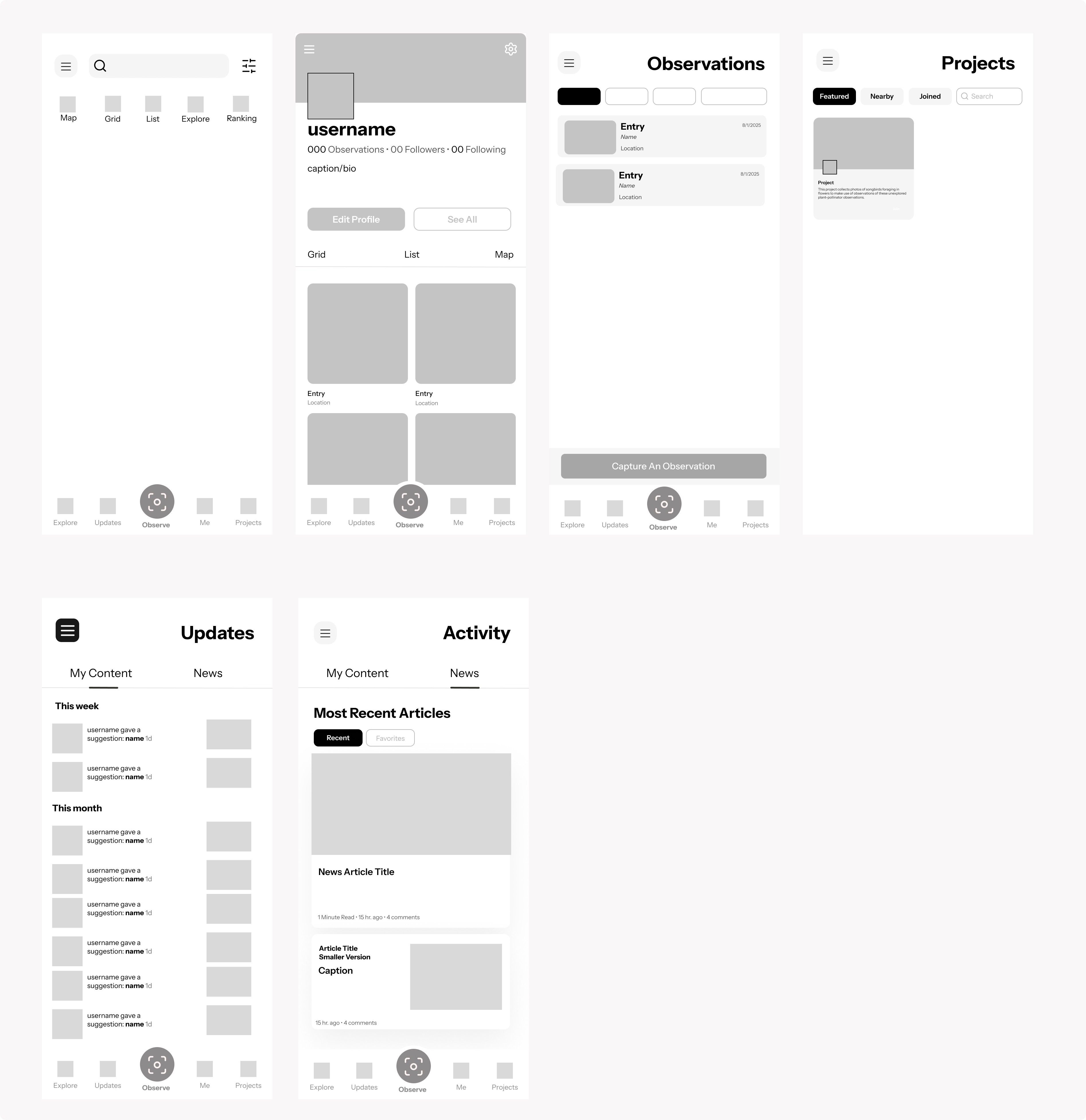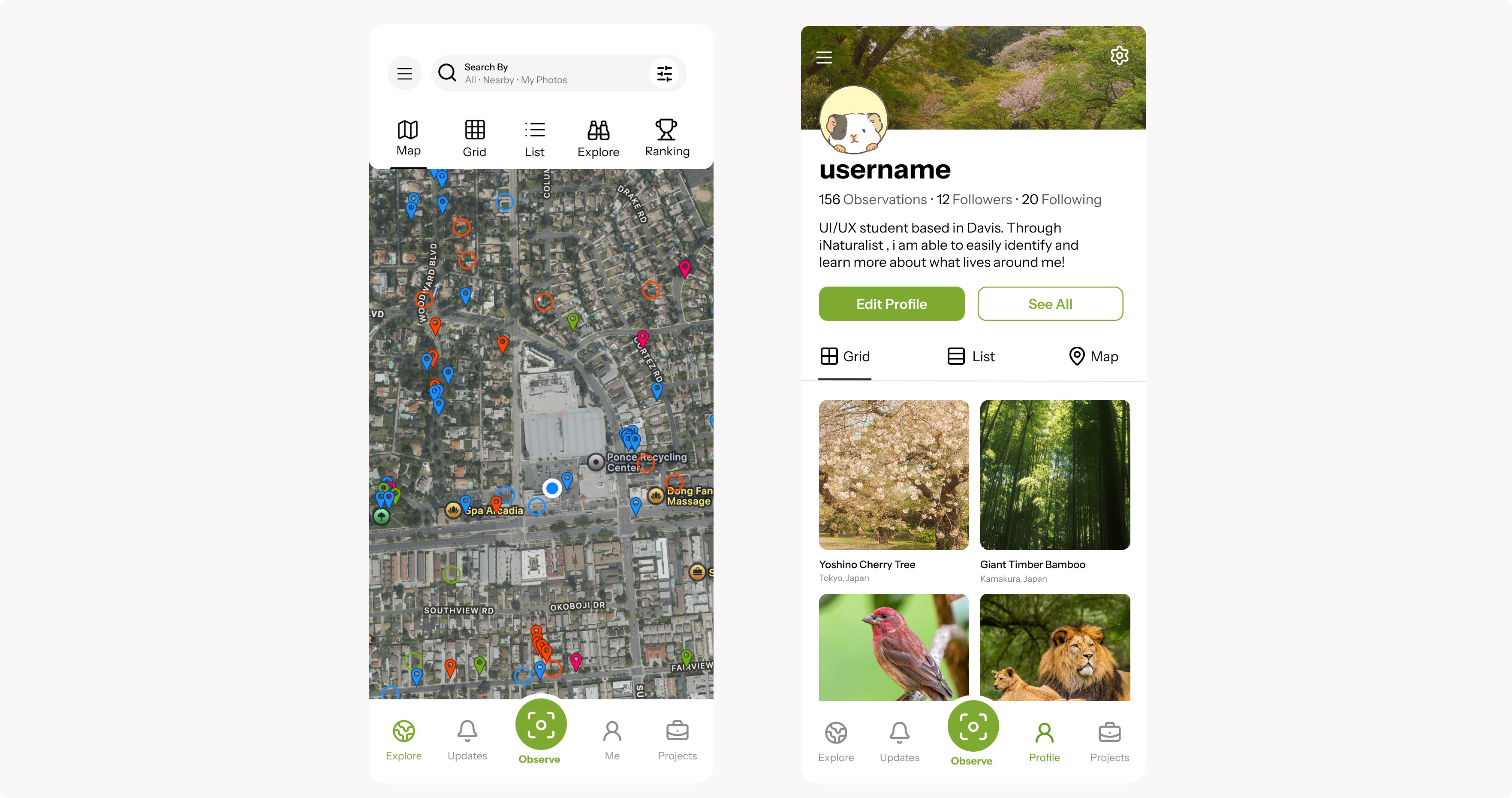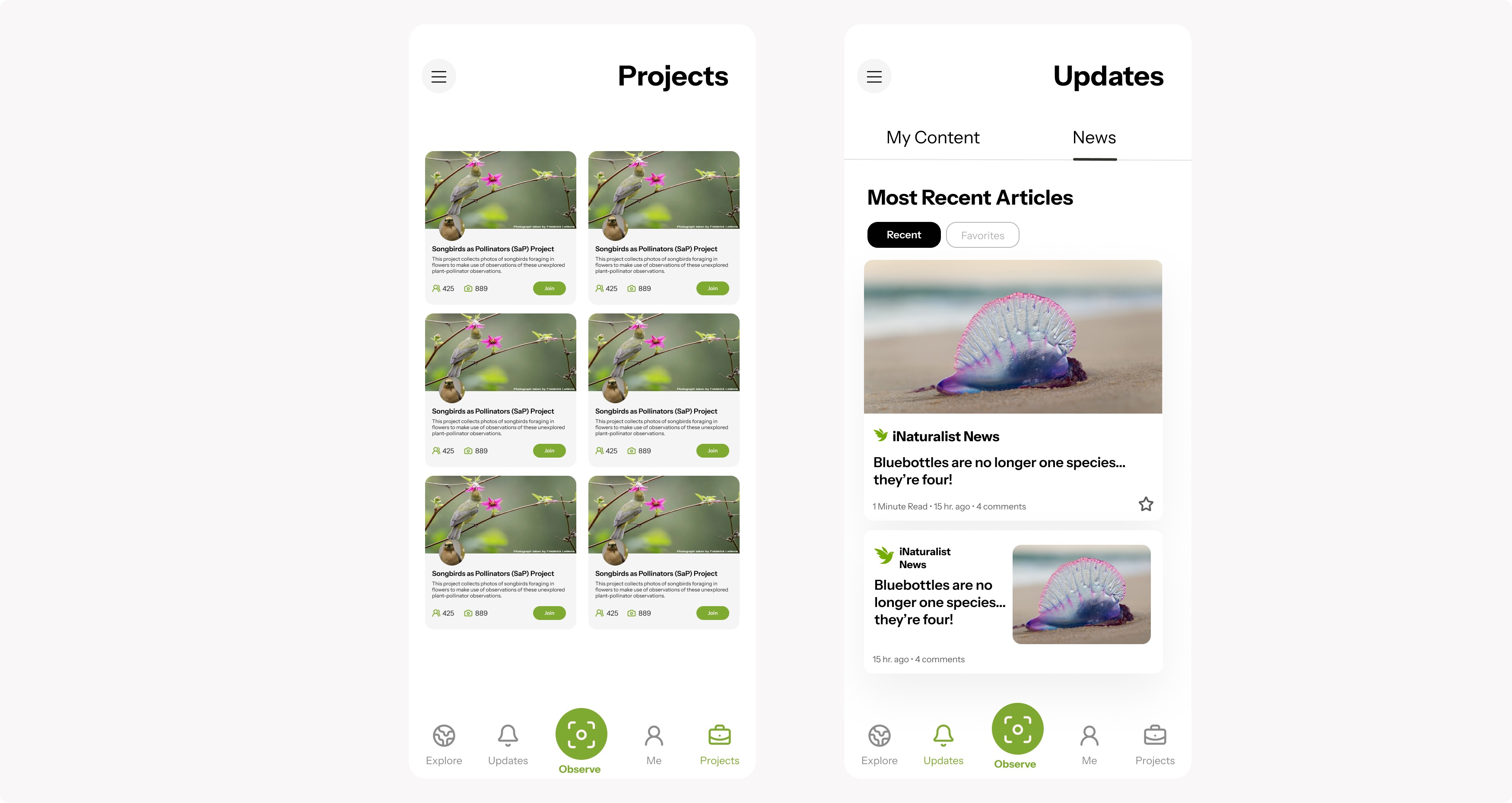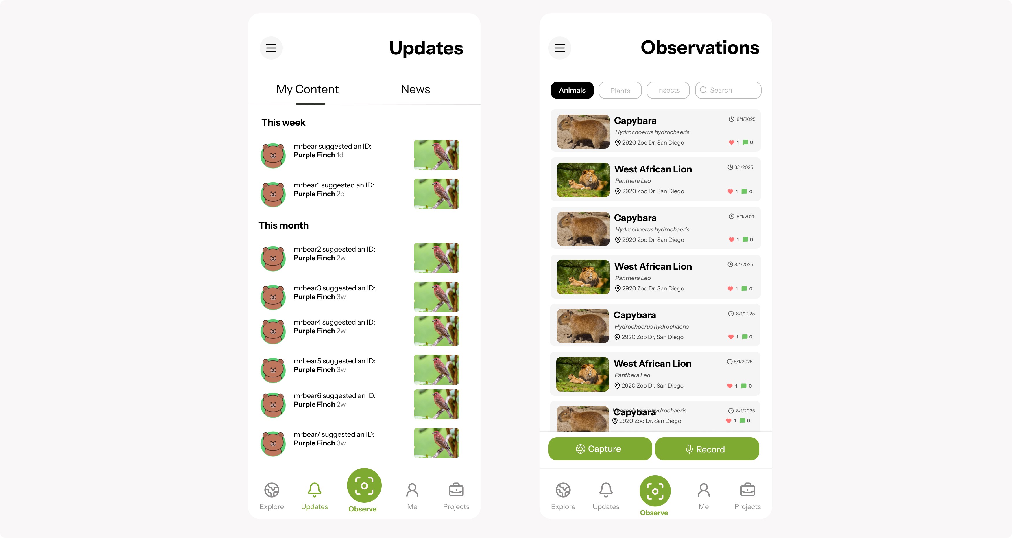 To improve usability based on observations, I consolidated the workflow so users can view and create observations in one unified “My Content” space. I restored Projects to the main navigation to improve discoverability of community features. I also rebranded Activity as Updates, creating a single, clearer hub for notifications and news.
