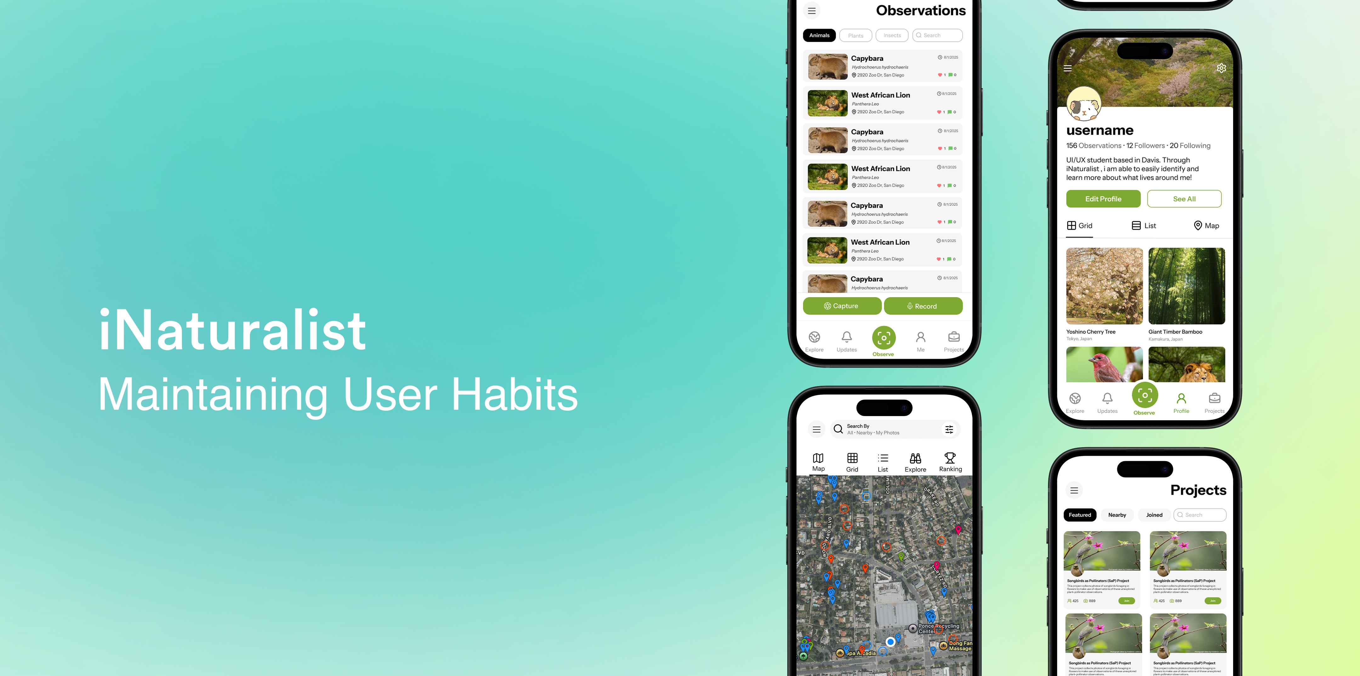 We tested the redesigned iNaturalist with three users familiar with the old layout. They completed key tasks like recording observations, browsing posts, and checking notifications, with clearer navigation improving speed and confidence.